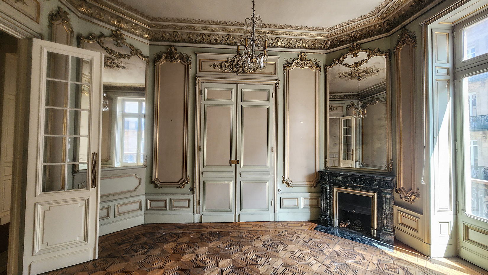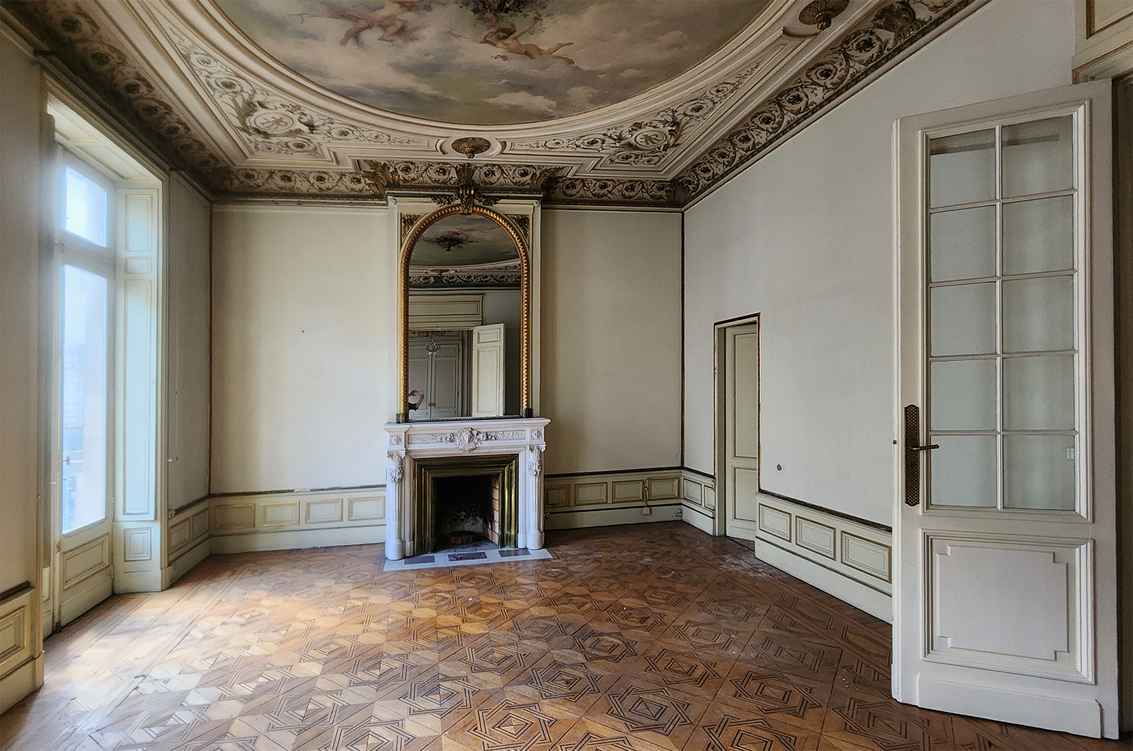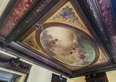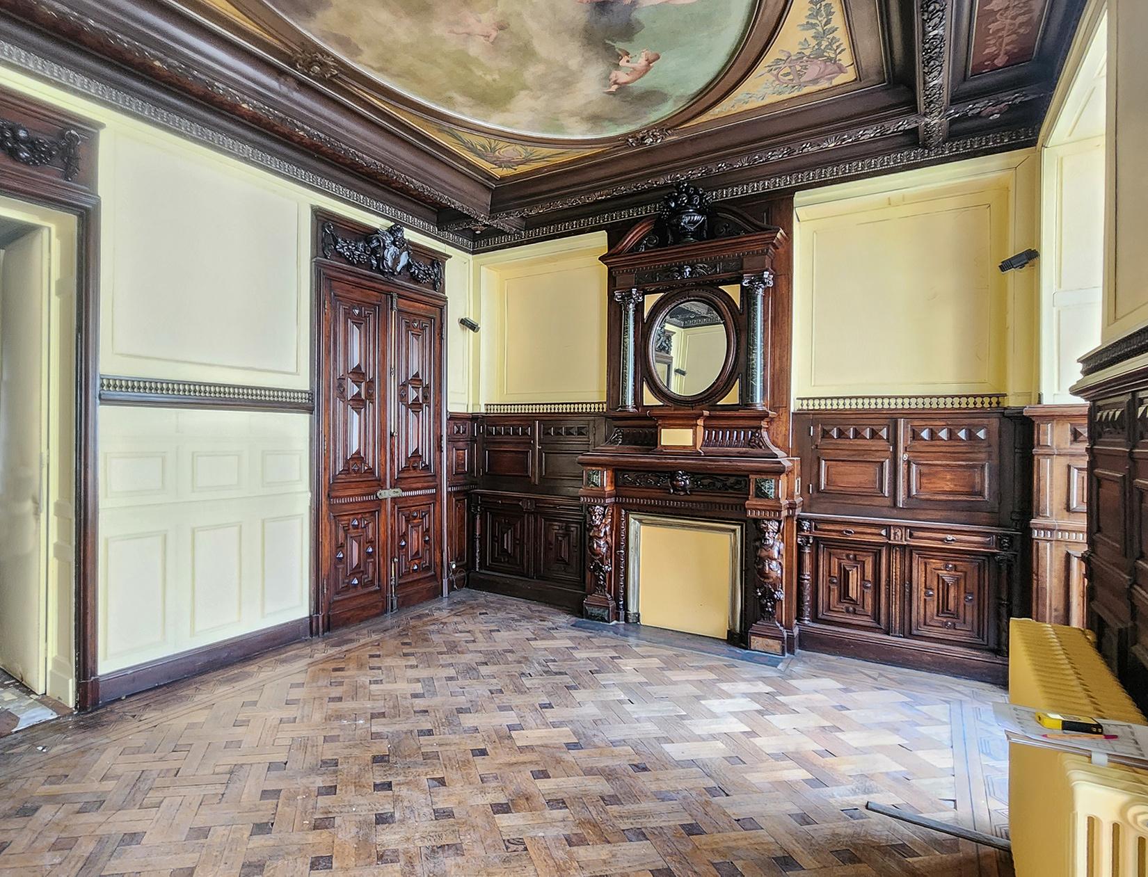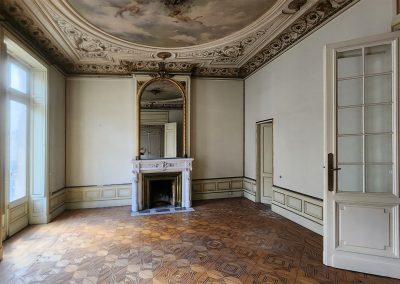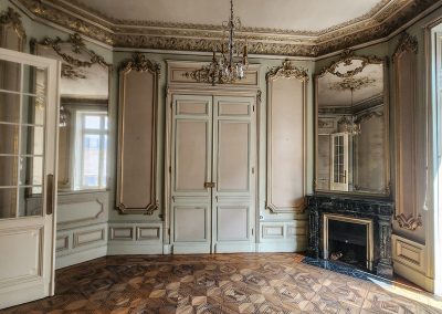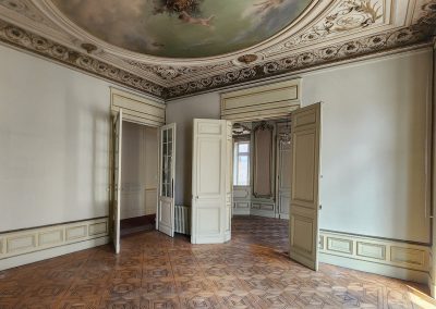 L’immeuble est entièrement traversant et se développe sur 7 niveaux dont un premier et un second étage abritant une série de salons décorés de lambris d’appuis, staff et cheminées.