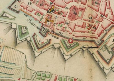 Son implantation est assez particulière car le monument est intégré et totalement « incrusté » dans le parement Nord de la contregarde du Château-Vieux constituant l’un des nombreux vestiges des défenses avancées de la ville.