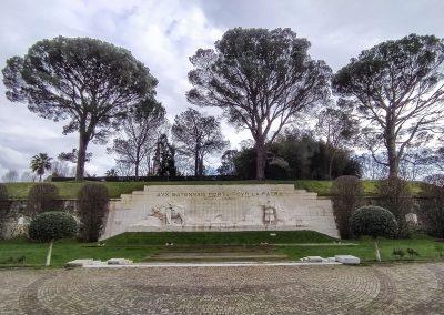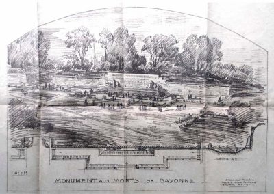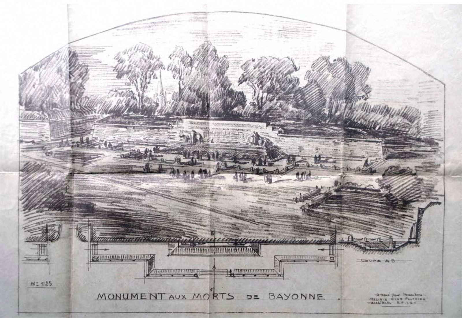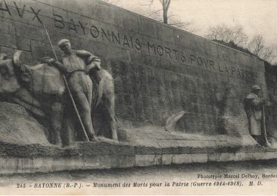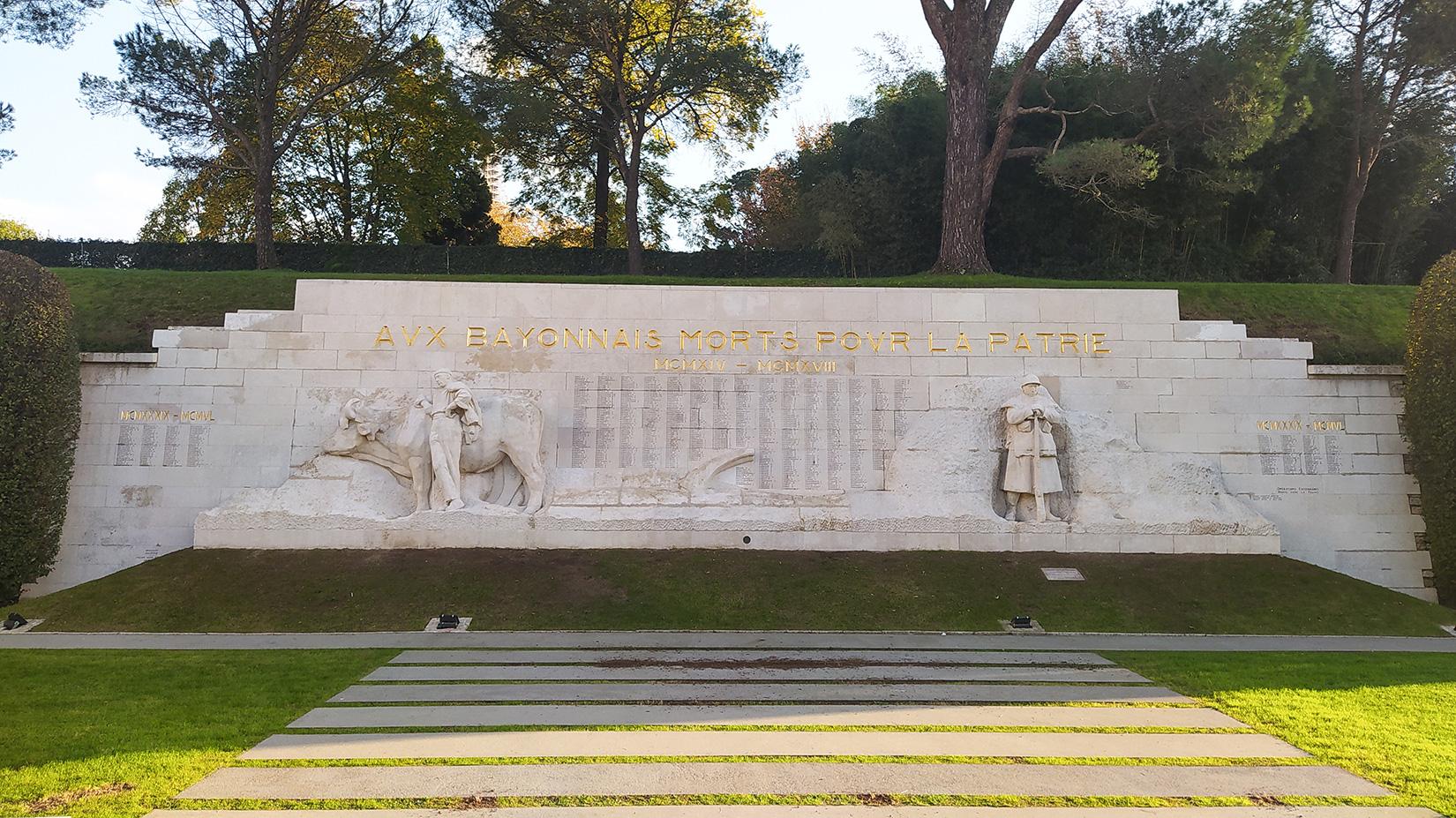 Ce monument, construit par le sculpteur Lucien Brasseur entre 1923 et 1924 sur les plans des architectes Molinié, Nicod et Pouthier, se présente sous la forme d’un long mur sur lequel s’appuient deux statues encadrant la liste des noms de citoyens bayonnais morts aux combats. D’un côté, le paysan basque, accompagné de son boeuf tirant une charrue, et de l’autre un poilu de garde. Au-dessus, trône en lettre capitale l’inscription « AUX BAYONNAIS MORTS POUR LA PATRIE ».