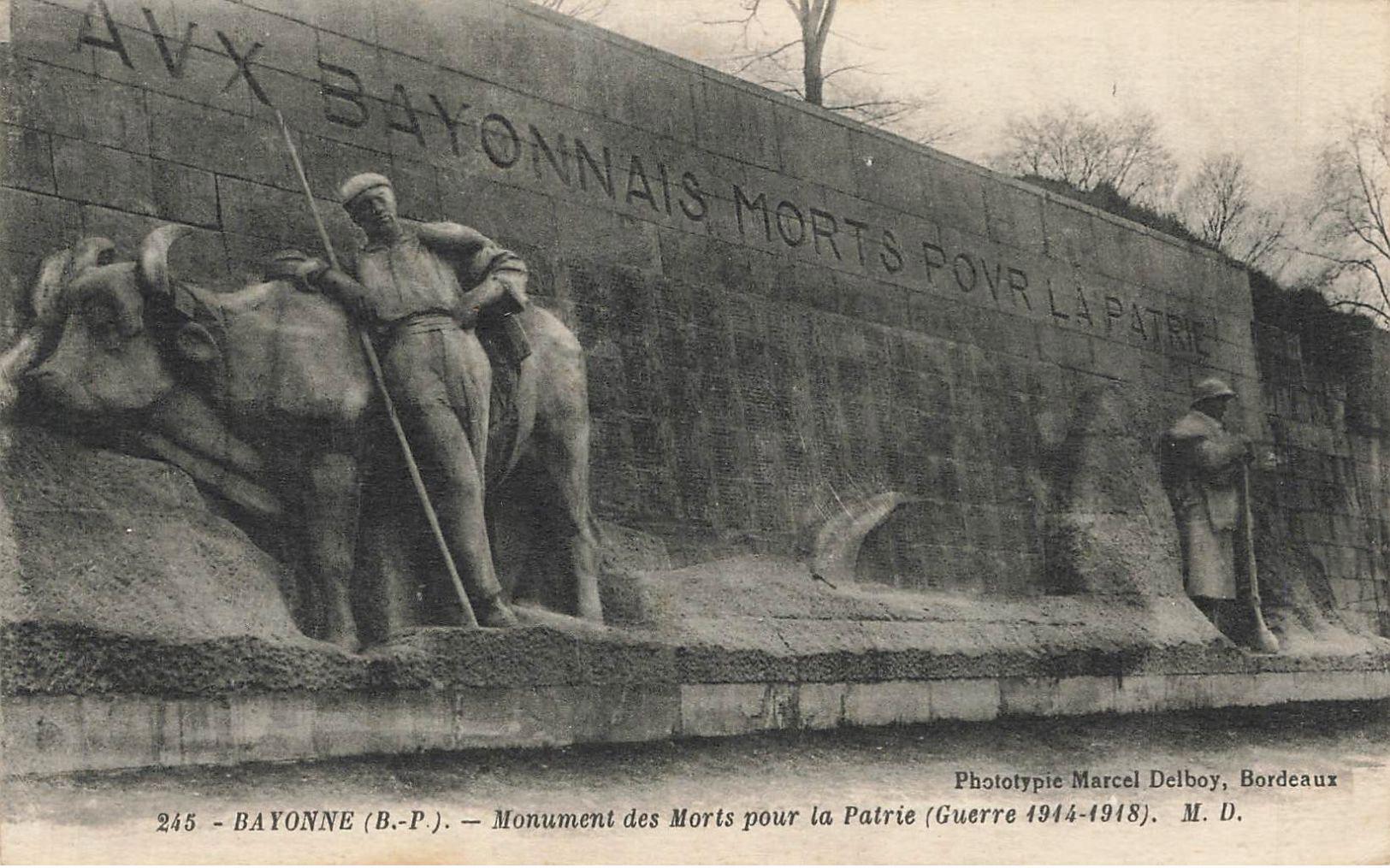 Ce monument, construit par le sculpteur Lucien Brasseur entre 1923 et 1924 sur les plans des architectes Molinié, Nicod et Pouthier, se présente sous la forme d’un long mur sur lequel s’appuient deux statues encadrant la liste des noms de citoyens bayonnais morts aux combats. D’un côté, le paysan basque, accompagné de son boeuf tirant une charrue, et de l’autre un poilu de garde. Au-dessus, trône en lettre capitale l’inscription « AUX BAYONNAIS MORTS POUR LA PATRIE ».